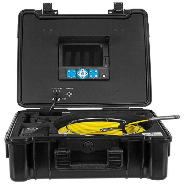| The Cable Reel | Rotatable cable reel is mounted in the case et can be rotated to pull out or back for convenient operation, and the operator do not need to take the cable reel out. Matériau du fil: tige en fibre de verre Longueur de la fibre de verre:20m(standard), 20m à 40m en option Diamètre de la fibre de verre: ø5,2mm Couleur de la fibre de verre: jaune Matériau de la roue à câble: Acier inoxydable Compteur de distance: mètre/pied en option, précis à 0,1 m ou 0,3 pied, il montre la longueur du câble que vous poussez dans le tuyau sur l'écran |