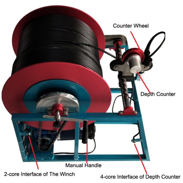 Trolul electric care permite înfășurarea cablului în sus și în jos cu viteze diferite(când sursa de alimentare 220V), iar troliul poate controla și manual. Besides inspection findings, Utilizatorii pot vizualiza profunzimea, the depth accuracy reach to 0.005m and it supports depth reset.